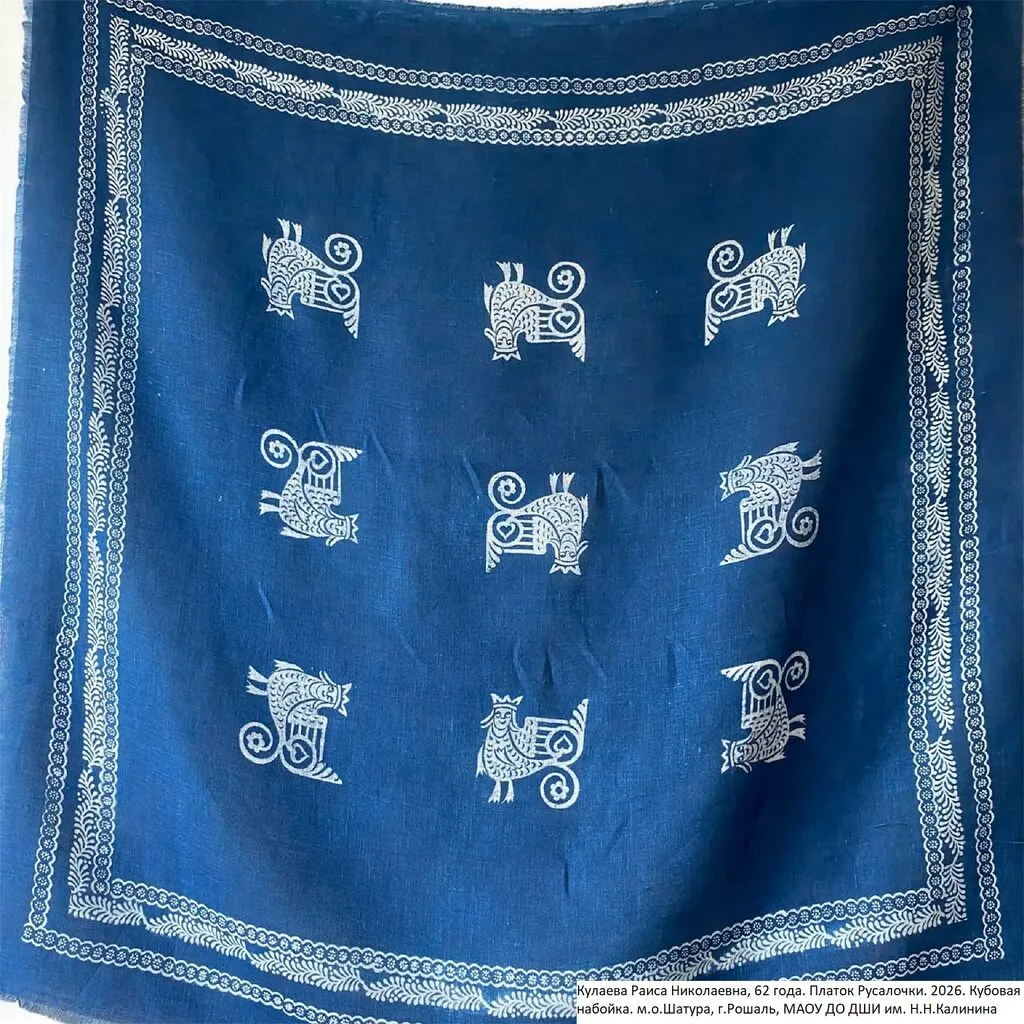 Кулаева Раиса Николаевна, Платок «Русалочки», кубовая набойка МАОУ ДО «ДШИ им. Н.Н. Калинина», МО, муниципальный округ Шатура, город Рошаль |