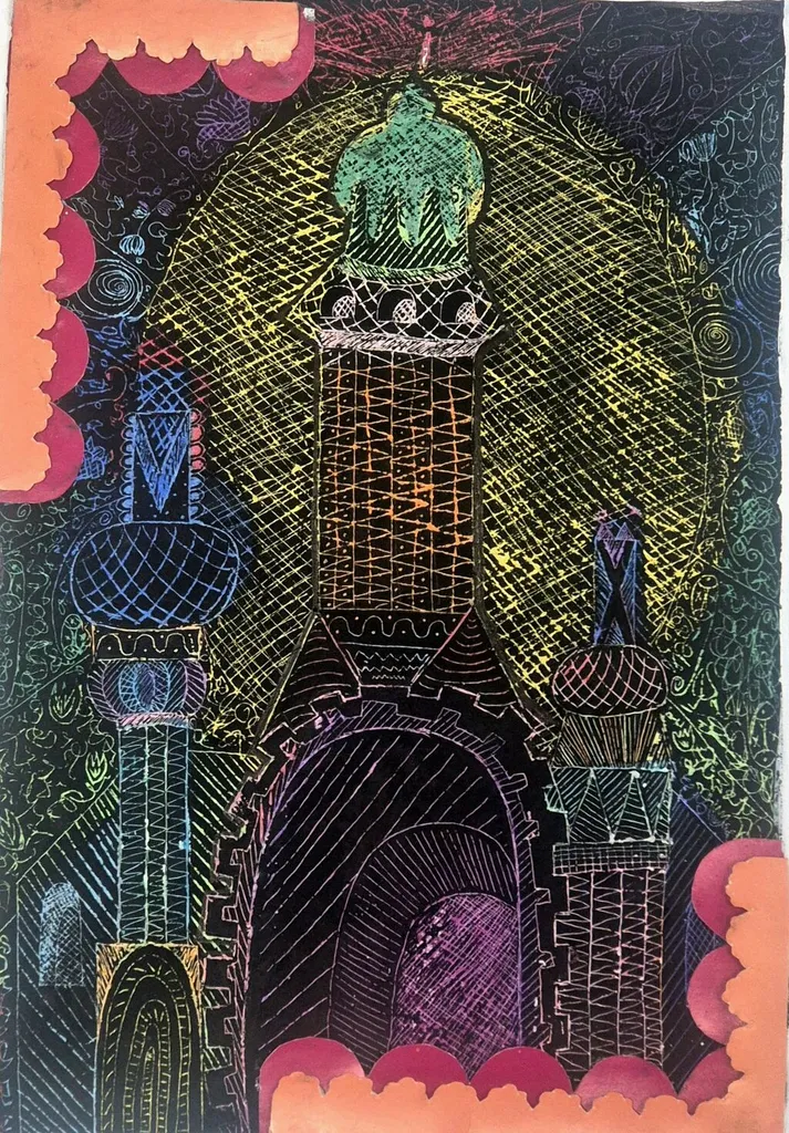 Елесина Дарья, 13 лет. Каменное узорочье. Граттаж МБУДО «Детская школа искусств № 1 им. Г.В. Свиридова» МО, Городской округ Балашиха, г. Балашиха |